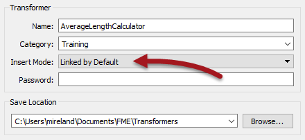 Select File > Export as Custom Transformer from the menubar. In the Export as Custom Transformer dialog make sure the Insert Mode option is set to Linked by Default. Make sure the Save Location is the default for storing custom transformers (<user>\FME\Transformers):