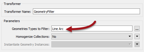 Inspect the parameters and select Line and Arc as the geometries to filter by: