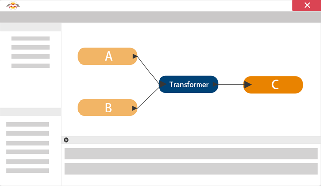 FME accomplishes data integration by reading data from multiple sources (in the graphic below, this is shown as sources A and B), using transformer tools to change or restructure the data to fit the users’ needs, and writing it to an output location (C):