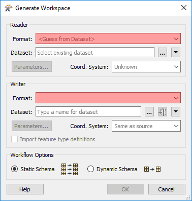 The Generate Workspace dialog condenses all the choices to be made into a single dialog box. It has fields for defining the format and location of both the data to be read, and the data to be written.