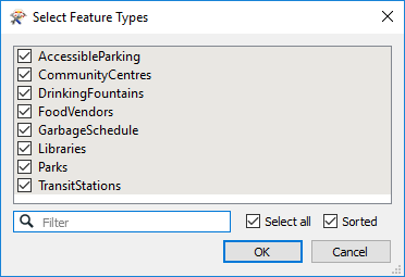Here, for example, is a Select Feature Types dialog where the user has chosen to include all available layers in the workspace.