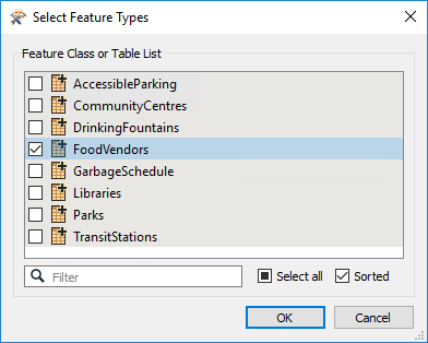 Click OK to accept the parameters. When prompted which tables to use from the source data (there are several) deselect all tables except for FoodVendors and click OK to create the workspace: