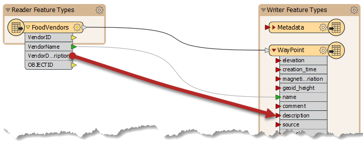 When first created, the reader and writer are not connected in this workspace. Connect them by dragging a connection from the output port of the reader feature type to the input port of the writer feature type labeled WayPoint: