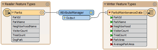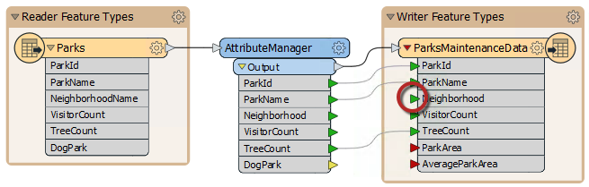 We can do this with a Tester transformer. Click on the connection from the AttributeManager output port to the ParksMaintenanceData feature type on the Writer.