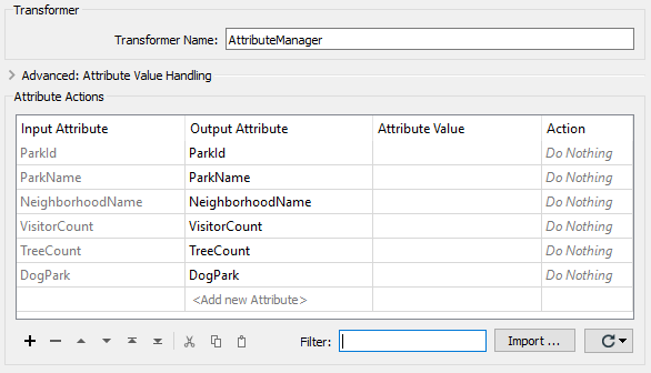 We could do this by simply drawing a connection, but it's generally better to use a transformer. There are two transformers we could use. One is called the AttributeRenamer and the other - which we shall use here - is the AttributeManager.