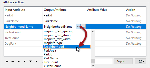 Where the Input Attribute field is set to NeighborhoodName, click in the Output Attribute field. Click on the button for the drop-down list and in there choose Neighborhood as the new attribute name to use:
