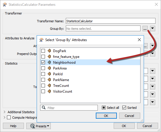 This is a straightforward task. View the parameters for the StatisticsCalculator transformer and click the 'browse' button next to the Group By parameter. Select the attribute called Neighborhood: