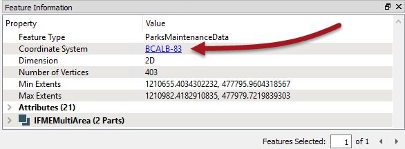 Open the newly reprojected dataset and select a feature. The Feature Information window should report that the data is now in BCALB-83. Optionally, click on the coordinate system name in that window; a new dialog will open to display all of the coordinate system parameters.