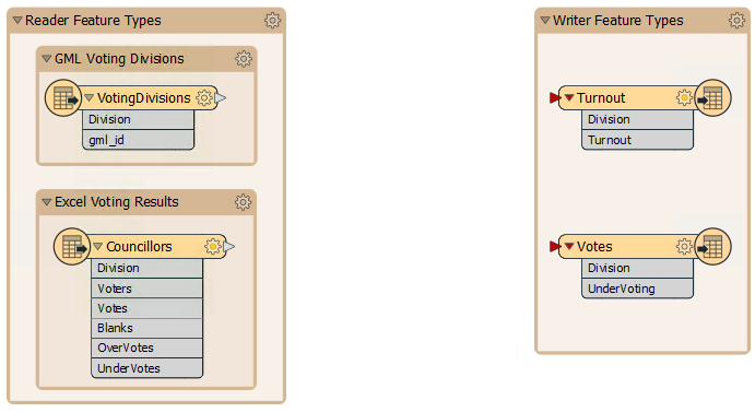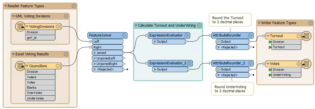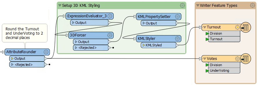 For the final step let's connect the AttributeRounder to the output schema. Simply make connections from the AttributeRounder to both writer feature types: