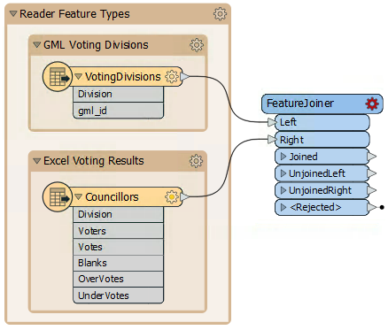 Add a FeatureJoiner transformer. Connect the VotingDivisions data to the Left port, and the Councillors (result) data to the Right port:
