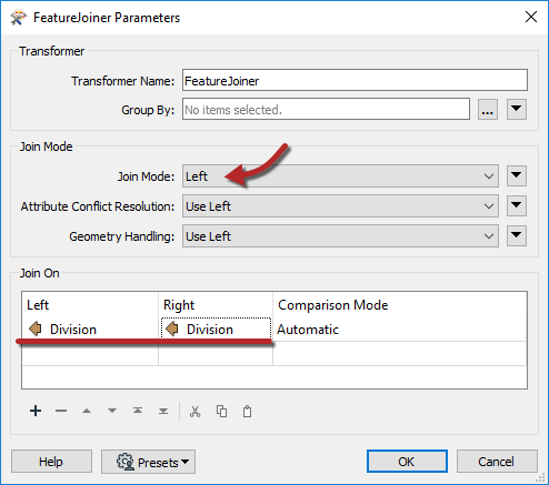 View the FeatureJoiner parameters. Because we want all of the voting division features we will do a Left join; therefore set the Join Mode to Left.