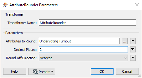 For the parameters, under Attributes to Round select the newly created Turnout and UnderVoting attributes. Set the number of decimal places to 2: