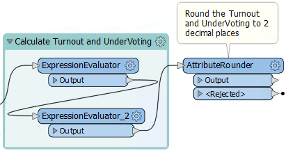 Now that we have the numbers we need, we can start to calculate some statistics. To do this, we'll use an ExpressionEvaluator transformer first to calculate the voter turnout percentage for each division.