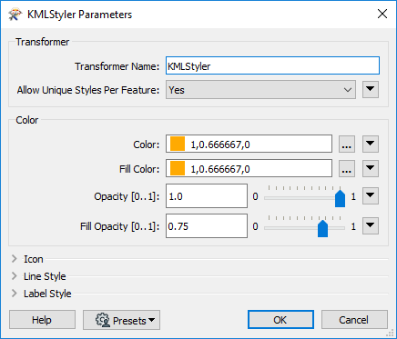 Add a KMLPropertySetter transformer after the 3DForcer. This transformer will allow us to set up the 3D blocks in the output. Set the geometry parameters as follows: