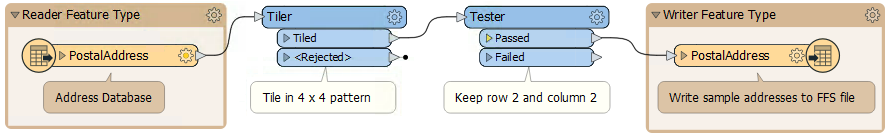 Here the workspace author is extracting a section of source data by reading from a database, splitting it into tiles, and writing just one tile to the FFS format. This one tile can be used for prototyping a solution in a way that is representative of the entire source database table.