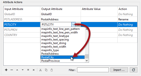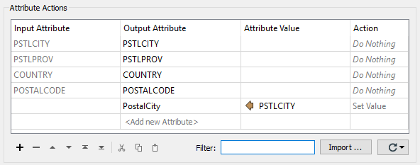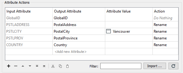 Here an AttributeManager is used to rename a number of fields by entering a different name for the Output Attribute. The Action is automatically set to Rename. Notice that the user is also entering a new constant value for the PSTLCITY/PostalCity attribute.