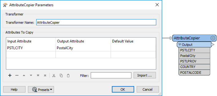 Note how both PSTLCITY and PostalCity exist on the output of the transformer, proving that it is copying the attribute rather than renaming it.