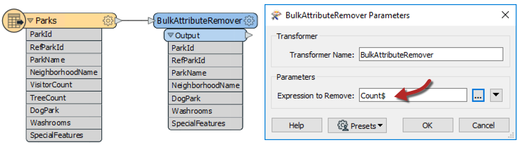 The BulkAttributeRemover - like the BulkAttributeRenamer - lets the user carry out a process on multiple attributes. In this case, instead of being able to select all attributes, the user enters a string-matching expression to define which attributes to remove: