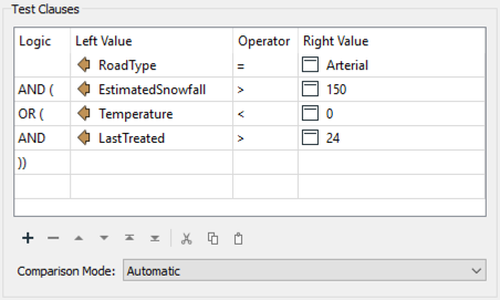 - Has there been more than 150 mm of snowfall? - Has there been more than 100 mm of snowfall AND is this an Arterial road? - Is the temperature less than zero degrees Celsius AND was sand last applied more than 24 hours ago? It’s a set of cascading tests because if there has been more than 150 mm of snow, the plows are sent out anyway; you don’t need to test any other criteria. So the test order can be very important. If every test is a fail, then the plows are not sent out. |