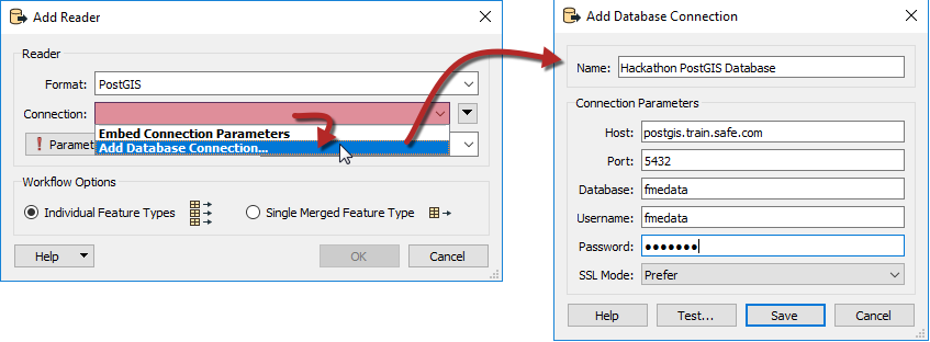 In FME Workbench, add a PostGIS reader, then for the Connection, click the drop-down and select Add Database Connection. Then in the Add Database Connection dialog, enter the connection parameters obtained through the web browser for the PostGIS on Amazon RDS database. For Name enter Hackathon PostGIS Database: