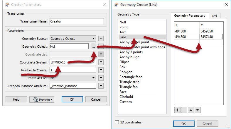 Firstly enter UTM83-10 as the coordinate system of the data we are about to create. For the Geometry Object parameter, click the [...] browse button to the right to open a geometry-creation dialog. Select Line as the geometry type and enter the following coordinates: