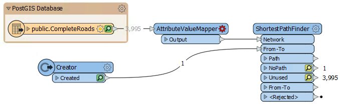 The other input port on the ShortestPathFinder is for the From-To path (the start and end points of our journey). There are many ways to create this - or even accept input from a web map - but here we'll manually create a feature with the Creator transformer.
