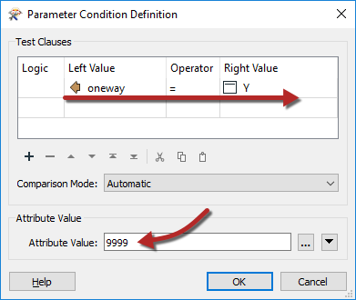 In the definition dialog that opens, double-click in the first "If" row and a Test Condition dialog opens. In here set up a test for oneway = Y. For the Output Value (bottom of the dialog) enter the value 9999 (for example, the cost of traveling the wrong way is really expensive)!