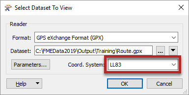 Now we're ready to go. Re-run the workspace. You could inspect the ShortestPathFinder:Path output port to see the results. However, if you want to see the actual written output, you will have to drag and drop the .gpx file onto Visual Preview. You can then specify to read the data with an LL83 coordinate system, as that information is not stored in GPX files: