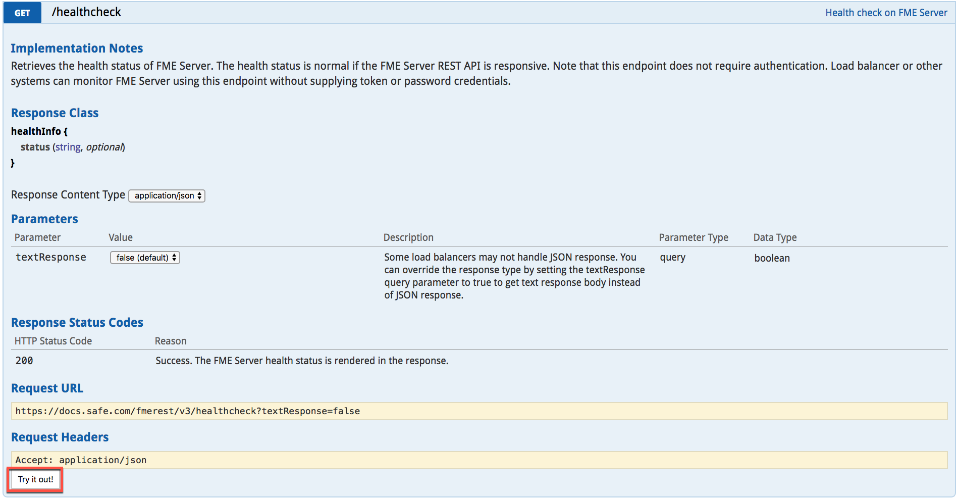 Here, you can explore the various calls you can make to FME Server. Find the third category called health check and expand the call. You should see documentation similar to this.