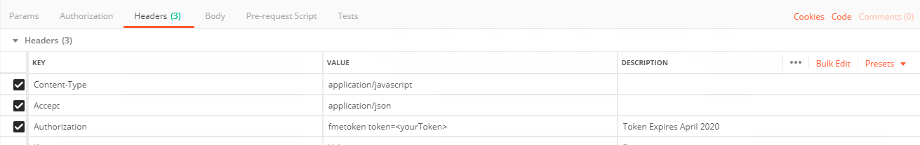 Notice the Transact statement indicates to FME Server that you will wait until the process is complete before receiving a result. In Postman you will need to set up the headers section and the URL as well. Carry out the following steps to set up this call in Postman.