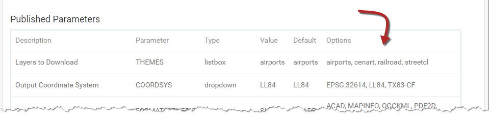Go to the Run Workspace page. Then, select Samples as the Repository and austinDownload.fmw as the workspace. Scroll down the page until you see the advanced section. Click on the plus sign, then find the published parameters. Here, we have all the parameters we can modify in the workspace. Look at the options, this time we will run the call with the railroad and streetcl options.