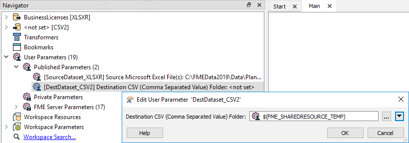 The next step is to identify the Published parameter of the destination dataset. Published Parameters are located in the Navigator panel of FME Workbench. It should be called DestDataset_CSV2. Right click on DestDataset_CSV2 and select Edit Value. Then using the drop-down arrow, expand the FME Server Parameter menu and select $(FME_SHAREDRESOURCE_TEMP).