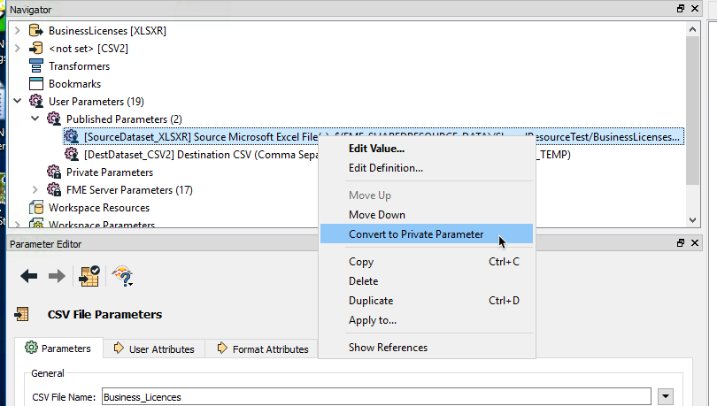 The next step is to set the Source Dataset to a private parameter. This can be accomplished by going to the navigator panel and then right-clicking on the parameter. Then select "Convert to Private Parameter."
