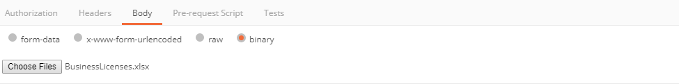 First, click on the body tab in Postman. Then, select Binary and click Choose Files.