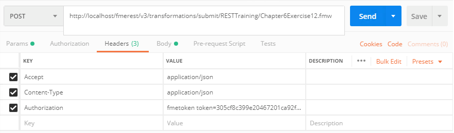 | POST | https://localhost:8443/fmerest/v3/transformations/submit/RESTTraining/Chapter6Exercise12.fmw |