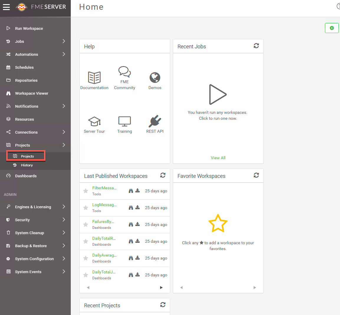 To import the project go to the left hand panel of your FME Server and select Projects.