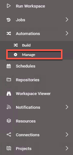 To get to the Automations page look at the left hand panel of FME Server. Select Automations and then, click Manage.