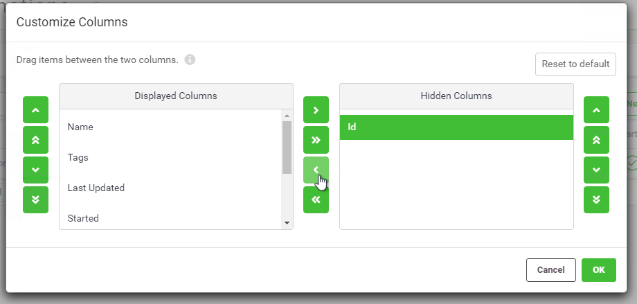 This will open the Customize Columns page. Find the Hidden Columns section and select Id and the arrow pointing to the left. This will move it over to the Displayed Columns.