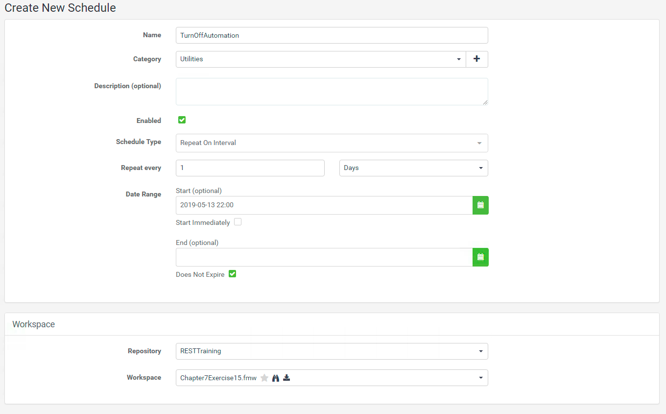 However, you may not want all automations to be enabled at all times. You could potentially have different automations active depending on the time of day. For instance, let's say you have automation that is enabled during the day time. This automation runs a workspace that is located in a repository that only has access to one engine due to a job queue. However, at night when FME Server is less busy, you may want to run the same workspace in a repository that has access to all engines. You could create two automations (one for the day and the other for the night) and using the REST API you could create a workspace to enable or disable them. This workspace could be run on a schedule to turn on or off your automations.