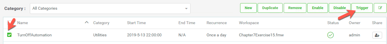 Select TurnOffAutomation and select Trigger. Even though the Schedule is not set to run until a few hours in the future. Selecting Trigger will trigger the Automation to run outside of the Scheduled time. This is a great feature for testing purposes.