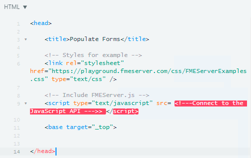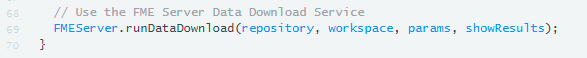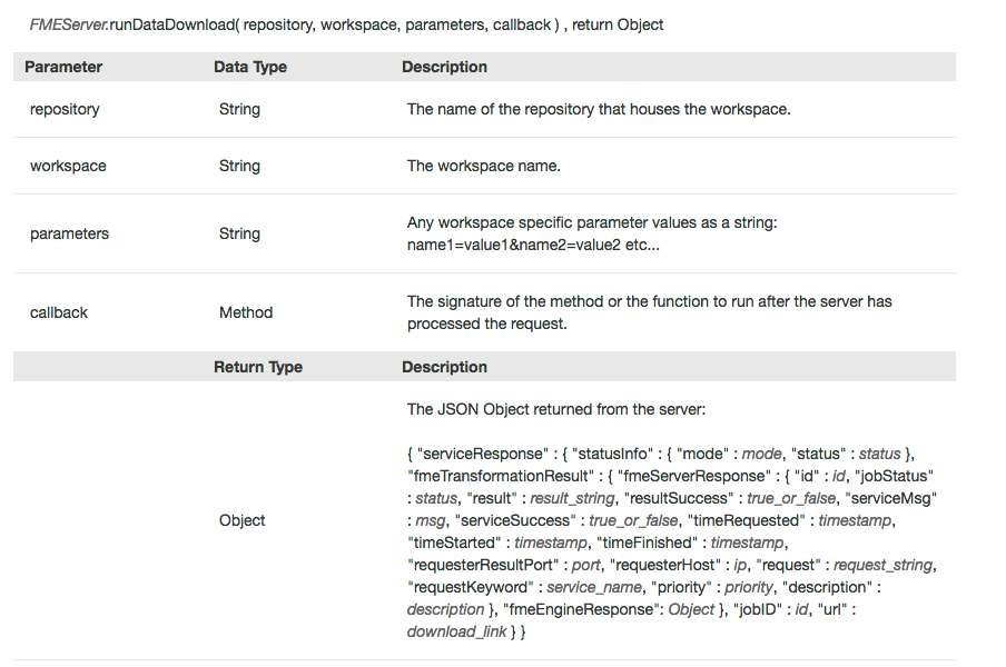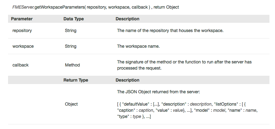 The link to the FME Server JavaScript API must be included in all applications that use the FME Server JavaScript API. It's a great resource to use if you would like to learn more about the FME Server JavaScript API because it lists all the available functions.