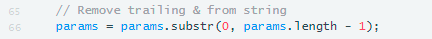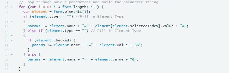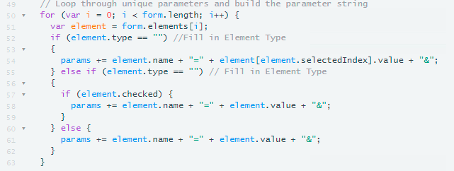 In line 52 we see the first if statement. This statement should say, if the element type is equal to select. Then add the element name and the selected value to the params variable. At the end of the params variable we are adding an ampersand or & so we can add another parameter.