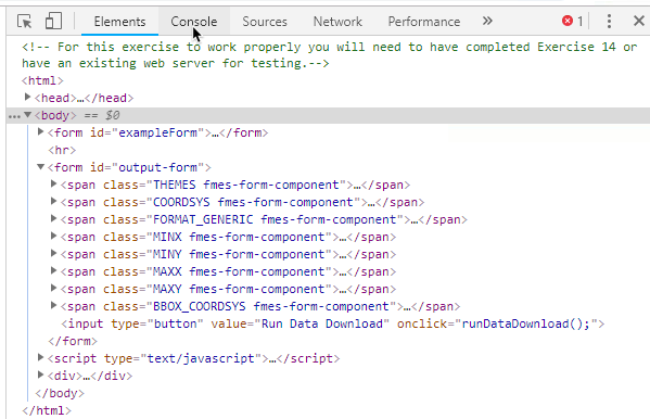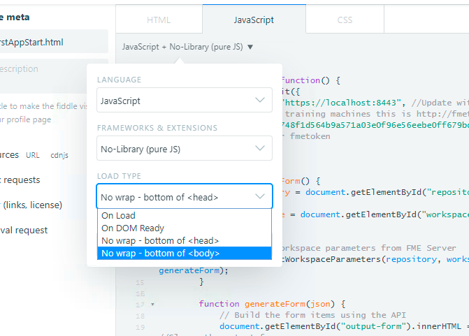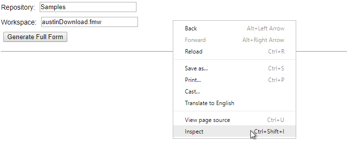 In this next exercise, we will dynamically create a form from a workspace that the end user will select. Once, the user has selected a workspace, a form will be generated with the user parameters from the workspace. The user can then select the parameters they'd like to use and run the workspace. Once, the workspace has run a link will appear on the page with a download link for the user. This code could be used if you wanted to create an application for clients to access data without going through the FME Server UI.