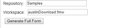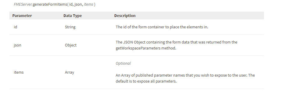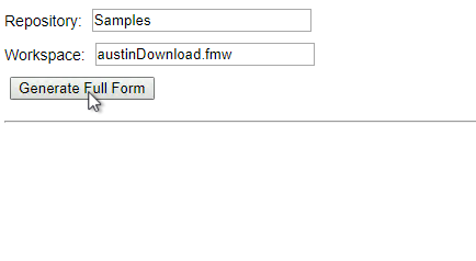 | Overall Goal | To display the capabilities of the FME Server JavaScript API. This exercise allows you to dynamically generate a form based on the parameters in a workspace and have a user fill in the parameters and run the workspace. |