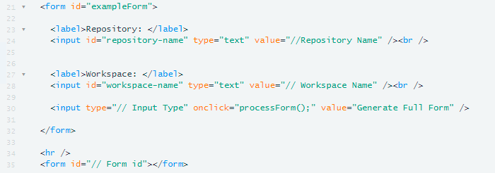In the form, we will create a label and an input. The label is entitled Repository: which will appear on the page. Then as with the form, we need to give the input an id so it can be called upon later. The input type is text. We need to edit the value on line 24 to be "Samples".
