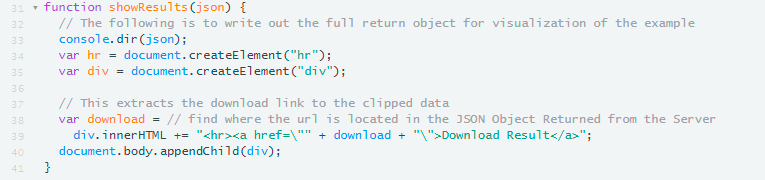 Next, we need to find the function above the runDataDownload function. This is showResults function and should be found on line 31.
