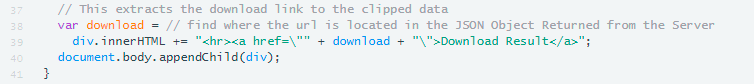 In the showResults function, on line 38 there is an empty variable for the download link.