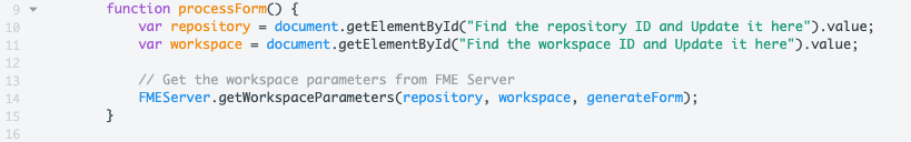 Next, we can view the processForm function this is located on line number 8. This function uses the FME Server JavaScript API to get the Workspace Parameters using the repository and workspace values entered by the user. We use the function getWorkspaceParameters to get the workspace parameters created in the call.