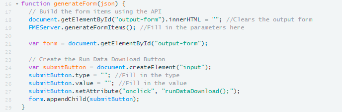 Go to the generateForm function, this is located on line 16. The next function is the callback function. A callback function is specified in the previous function. It takes the json returned from FME Server and uses it.