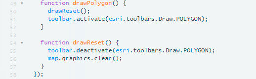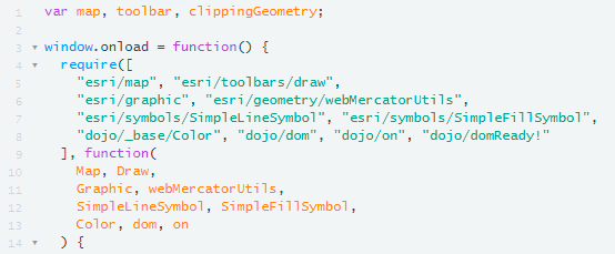 Review the first 14 lines of code of the document. The first line of code creates the variables for the map, toolbar and clipping geometry. On line 3, we have a function that will be activated when the window loads.